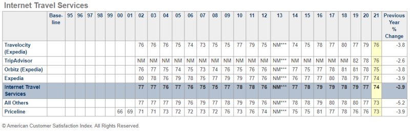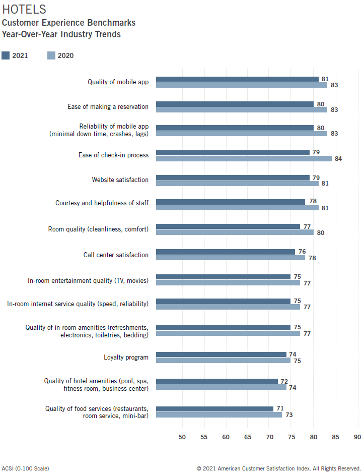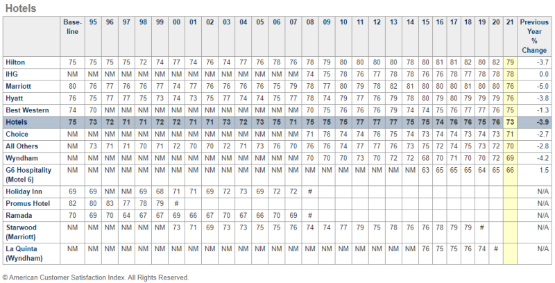 2021년 ACSI(American Customer Satisfaction Index) 결과 미국 호텔 고객만족도 순위