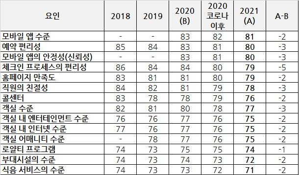 호텔 산업의 만족도가 하락한 것과는 대비되는 모습인데요.