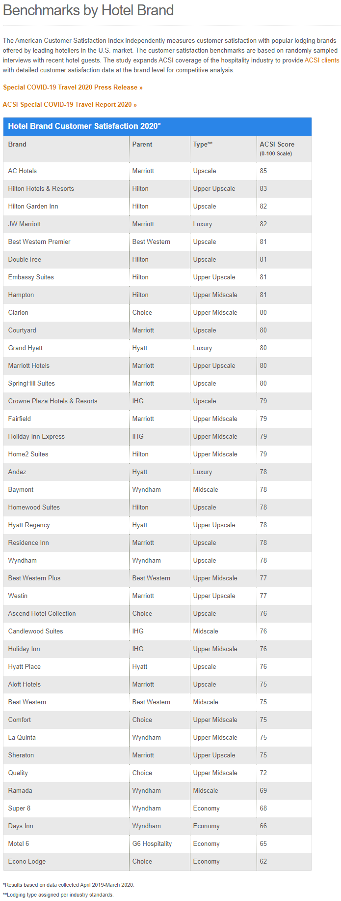 2020년 ACSI(American Customer Satisfaction Index) 결과 미국 호텔 고객만족도 순위
