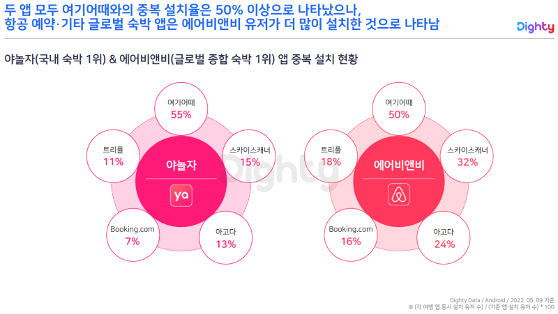 반면, 에어비앤비는 여기어떄, 스카이스캐너, 아고다 등 다양한 앱과 중복으로 설치되었습니다.