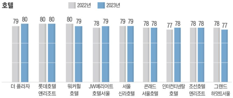 국내 호텔 산업의 만족도는 79점으로 22년과 동일했습니다.