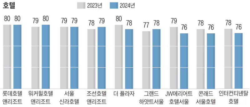 롯데는 전년과 동일한 수준을 기록했고, 워커힐은 1점 상승했습니다.