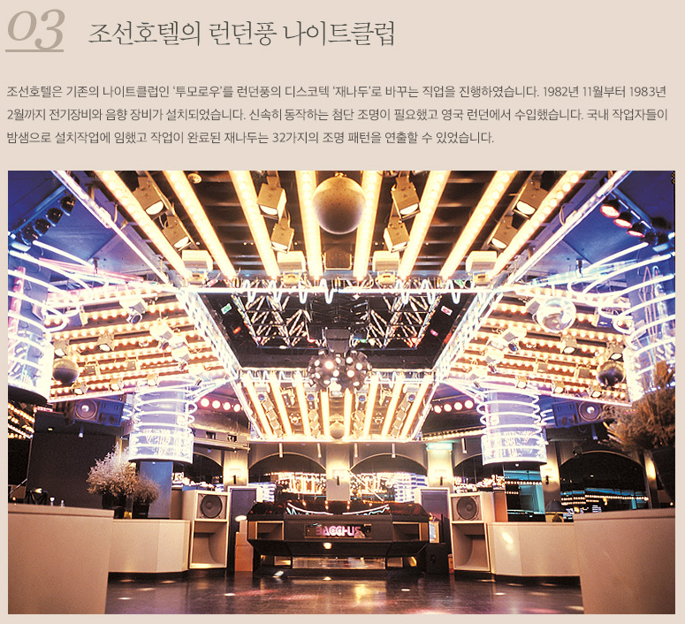 조선호텔은 기존의 나이트클럽인 '투모로우'를 런던풍의 디스코텍 '재나두'로 바꾸는 작업을 진행하였습니다. 1982년 11월부터 1983년 2월까지 전기장비와 음향장비가 설치되었습니다. 신속히 동작하는 첨단 조명이 필요했고, 영국 런던에서 수입했습니다. 국내 작업자들이 밤샘으로 설치작업에 임했고 작업이 완료된 재나두는 32가지 조명 패턴을 연출할 수 있었습니다.