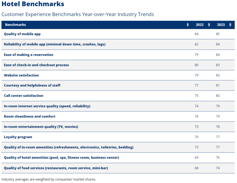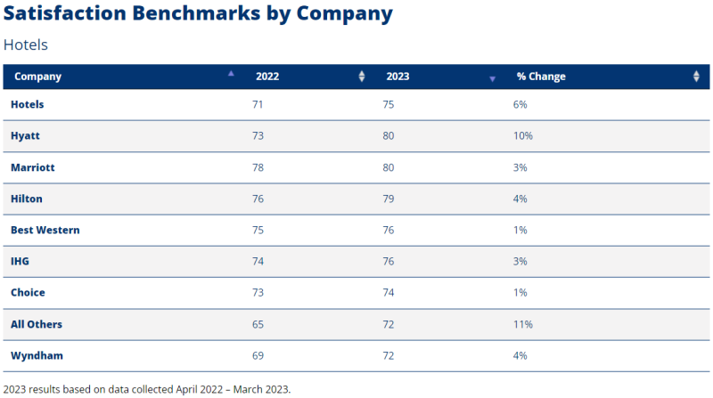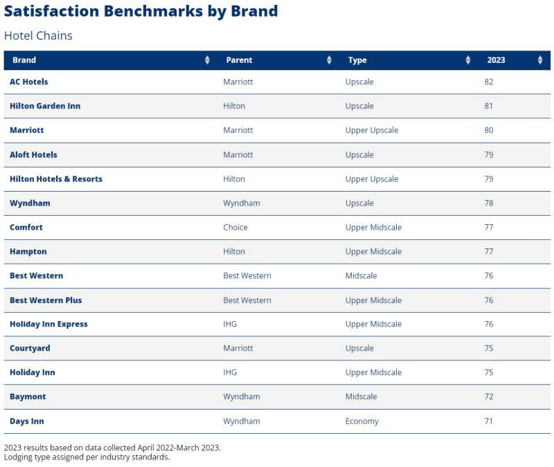 ACSI(American Customer Satisfaction Index) 결과 미국 호텔 고객만족도 순위(2023년)