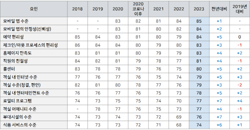 체크인/아웃 프로세스, 직원 친절성, 객실 수준, 객실 어매니티 요인을 제외한 나머지 요인은 2019년 대비 높은 평가를 받았습니다.