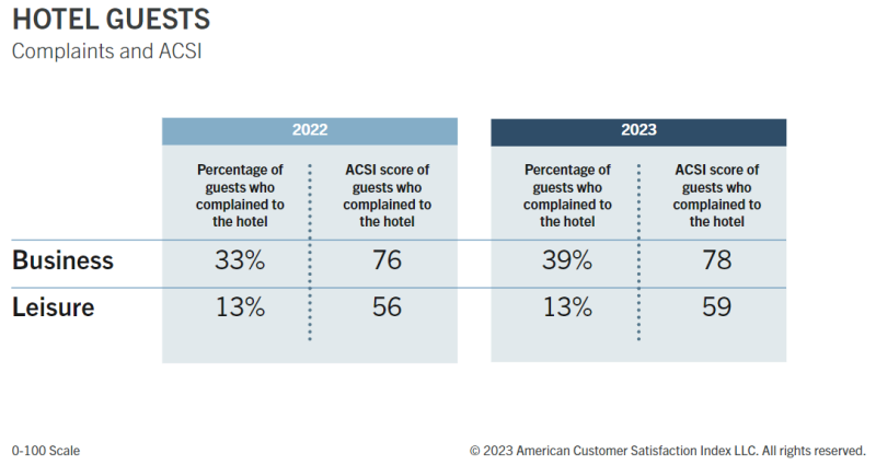 불만을 표시한 고객들의 만족도 역시 예년과 마찬가지로 휴가(레저) 목적으로 방문한 고객들이 더 낮았습니다.