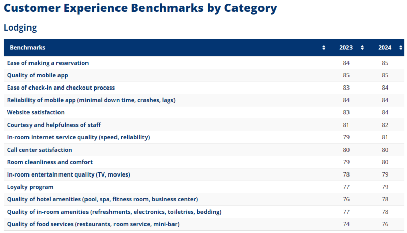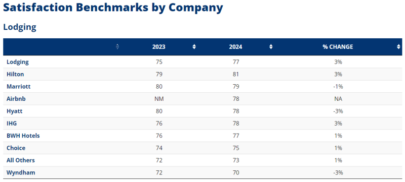ACSI(American Customer Satisfaction Index) 결과 미국 호텔 고객만족도 순위(2024년)
