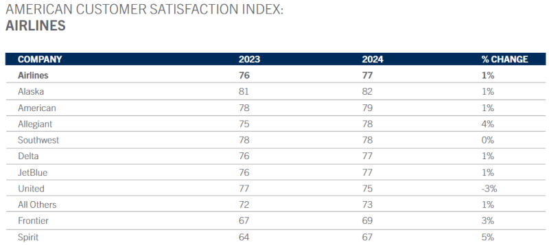 2위는 아메리칸항공이었으며, 공동 3위는 얼리전트항공, 사우스웨스트였습니다.