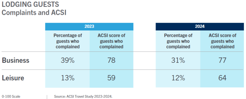 불만을 표시한 고객들의 만족도 역시 예년과 마찬가지로 휴가(레저) 목적으로 방문한 고객들이 더 낮았습니다.