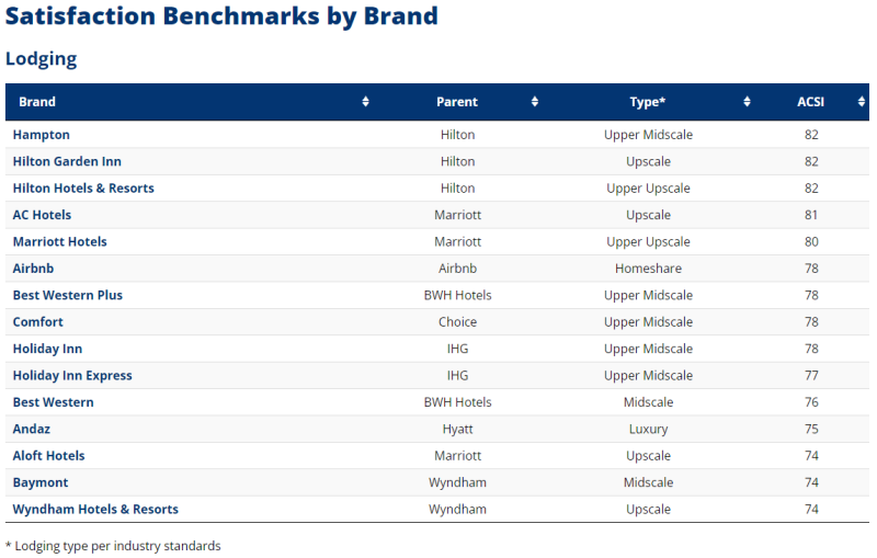 ACSI(American Customer Satisfaction Index) 결과 미국 호텔 고객만족도 순위(2023년)