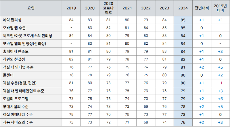 객실 수준을 제외한 모든 요인에서 19년 대비 높은 모습을 보였습니다.
