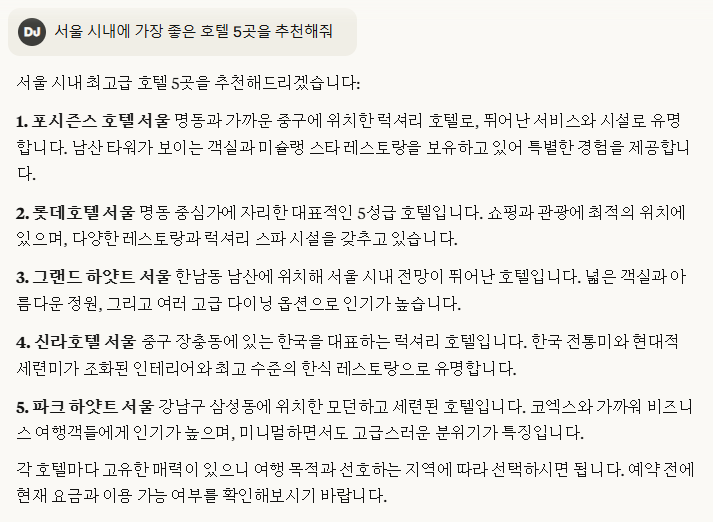 전반적으로 AI가 좋은 호텔들을 추천해주고 있다는 것을 알 수 있습니다.