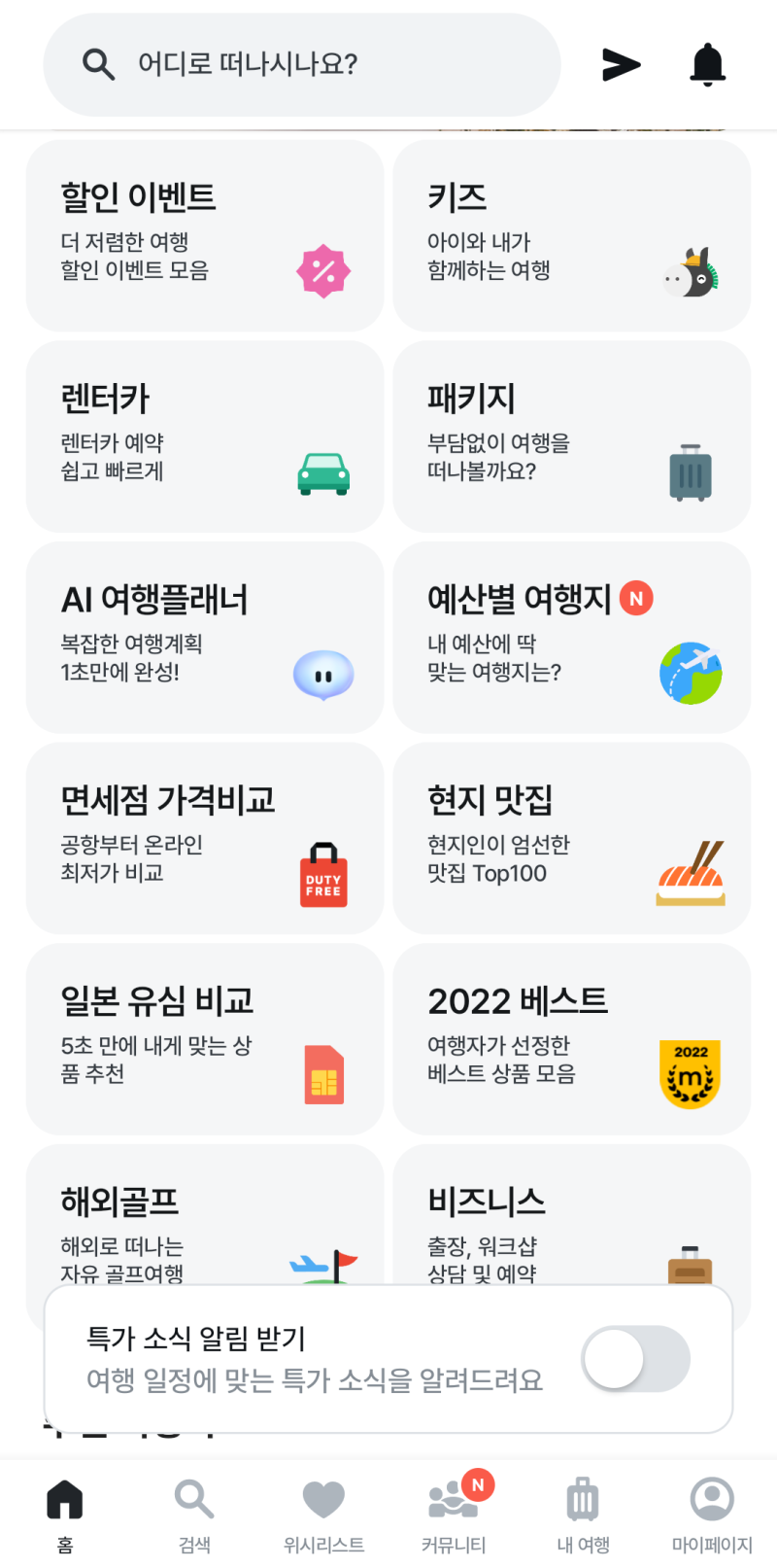 마이리얼트립 앱에 들어가보면 'AI 여행플래너'라는 이름으로 메뉴가 있습니다.