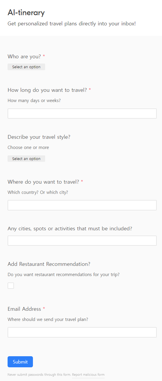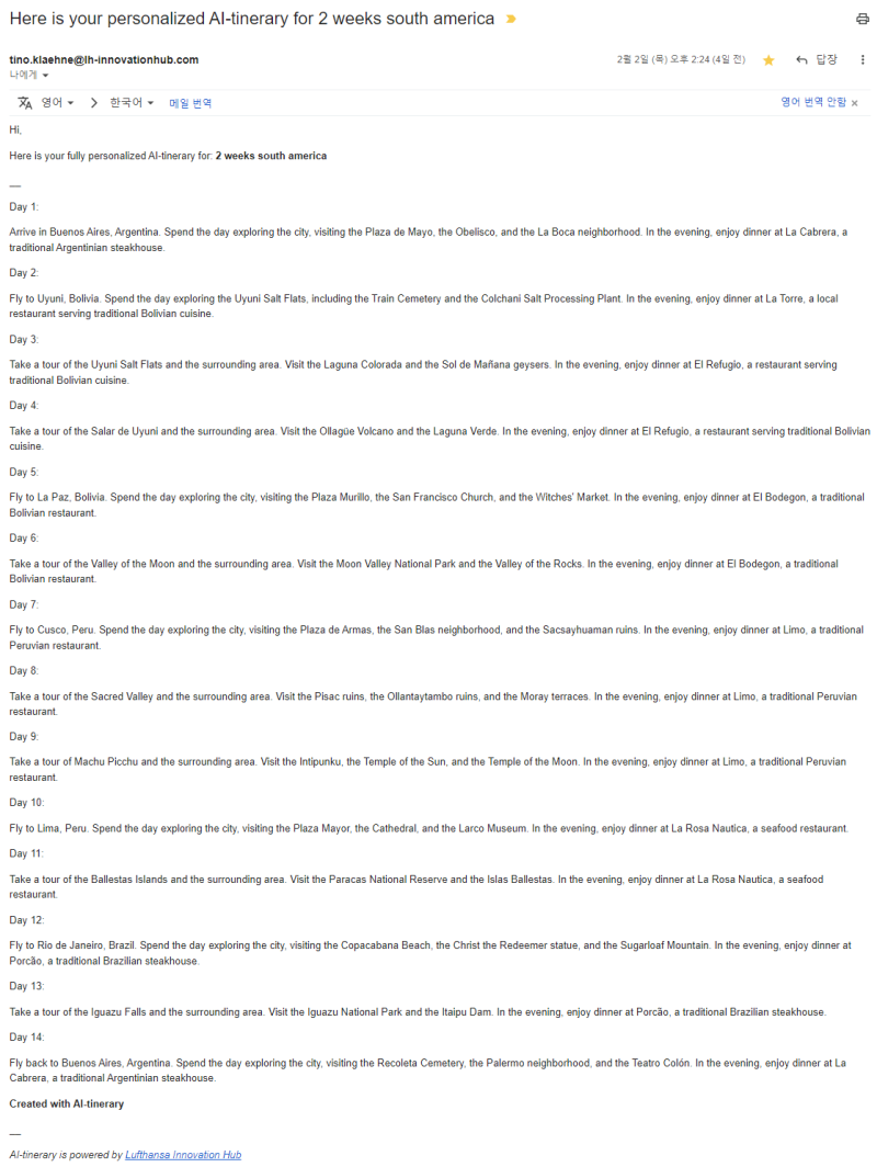 루프트한자 이노베이션 허브(Lufthansa Innovation Hub)에서 만든 "AI-tinerary" 라는 사이트 입니다.