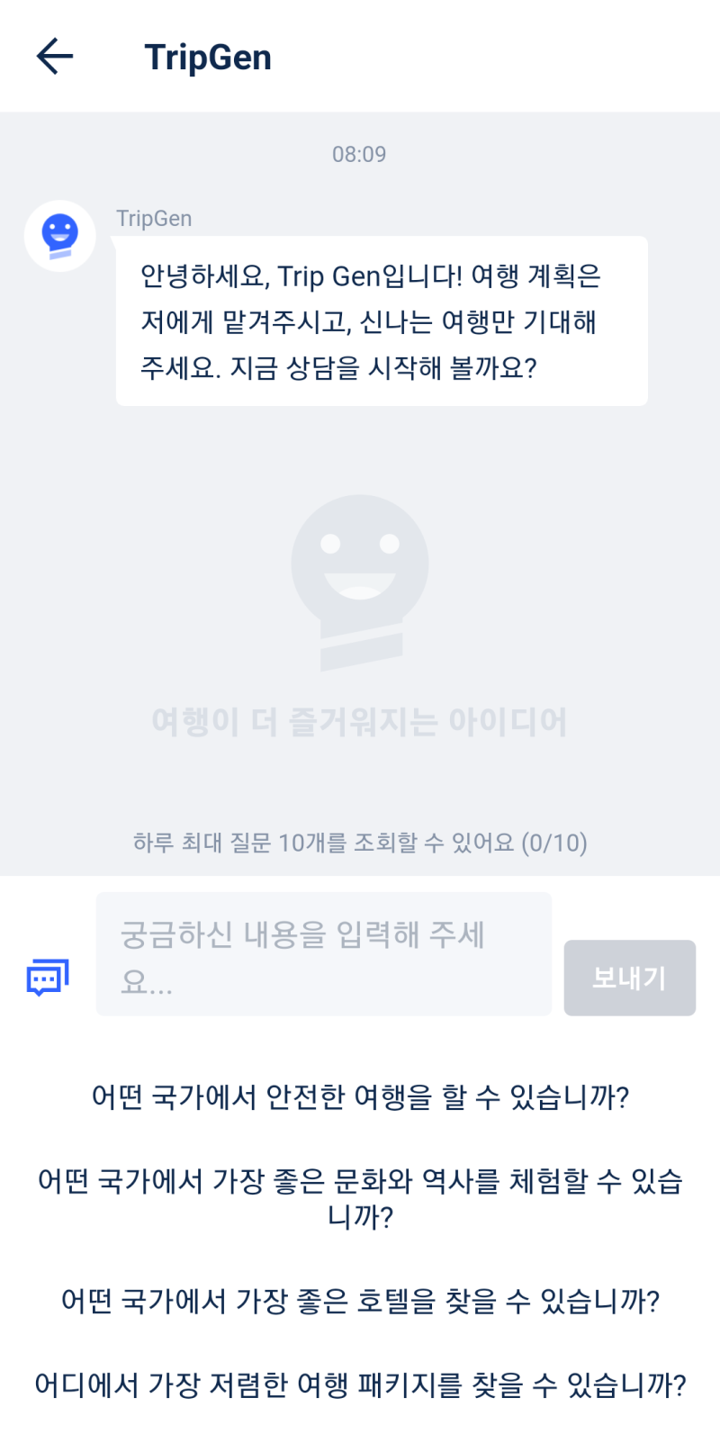 트립젠의 메인페이지로 중간에 채팅서비스 시작하기를 누르시면 챗봇서비스를 이용하실 수 있습니다.