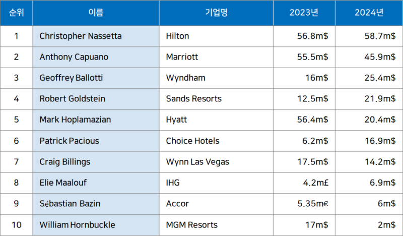 [Data&Insight]호텔 체인 CEO 연봉 순위(2024년)