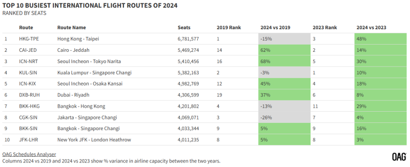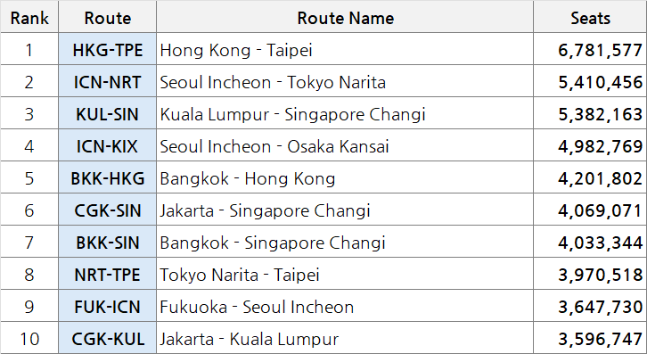 1위를 차지한 홍콩-타이페이 노선은 2019년 대비 15%가 감소한 수치입니다.