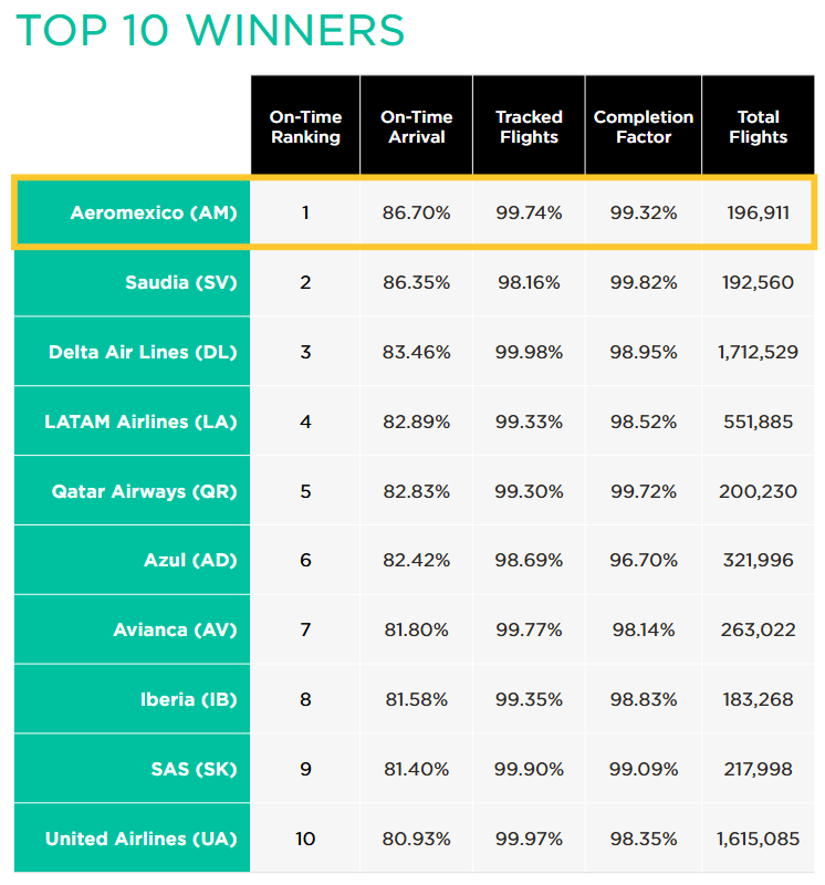 정시성기 가장 뛰어난 항공사는 아에로멕시코였습니다.