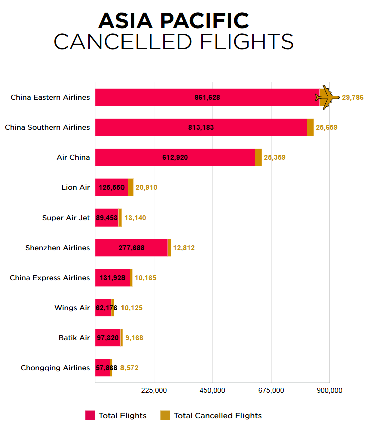 아시아 태평양 지역의 항공사의 취소편수를 살펴보면,