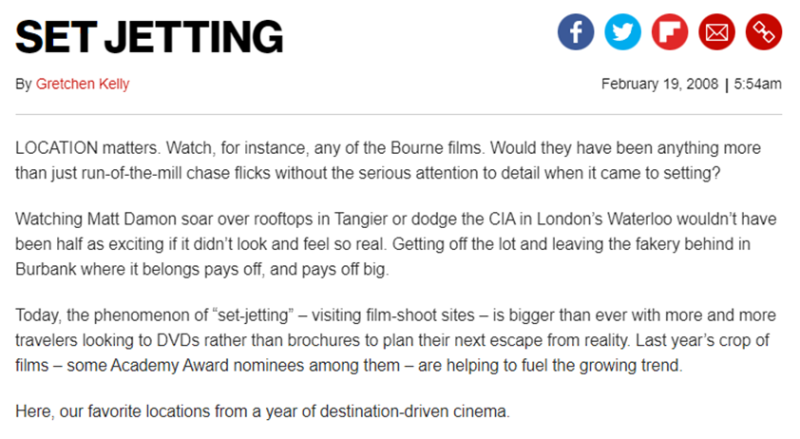 Set-Jetting이라는 단어는 2008년 Gretchen Kelly가 New York Post에 처음으로 사용했습니다.