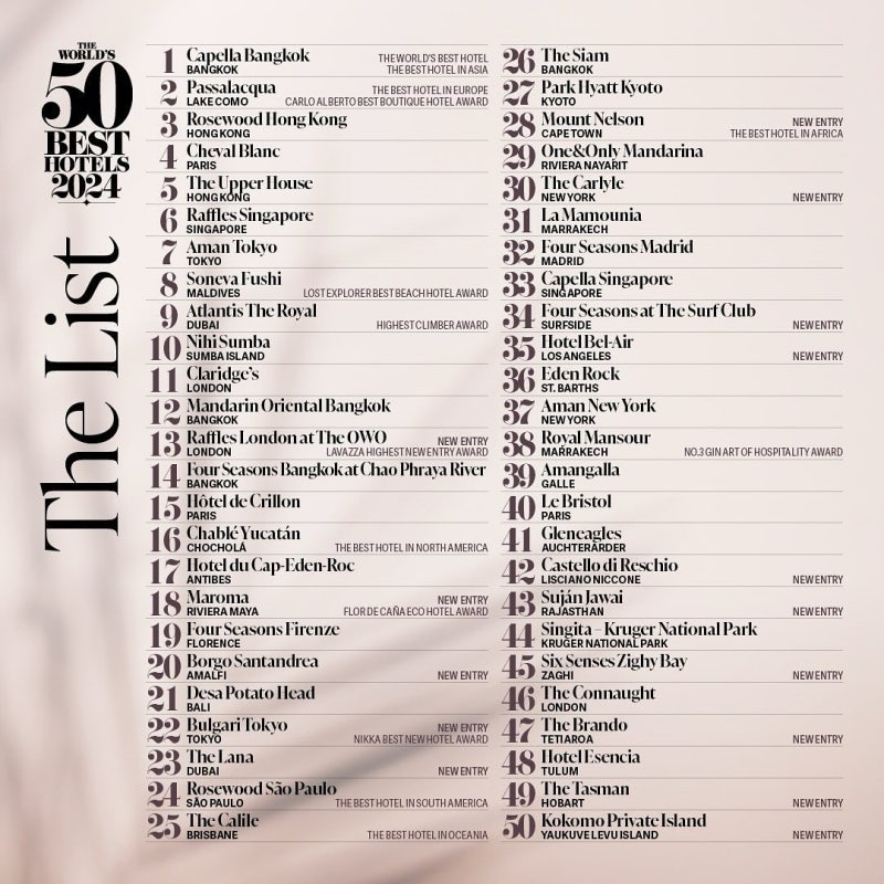 The World's 50 Best Hotels 결과(2024년)