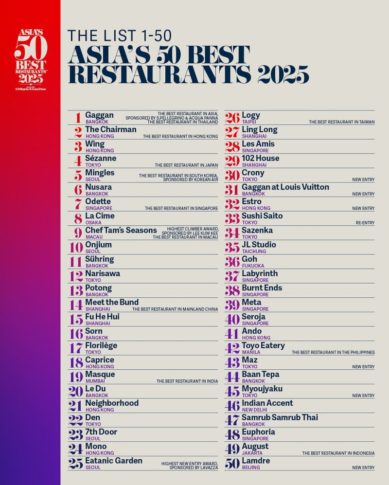 The World's 50 Best Restaurants 결과(2025년)