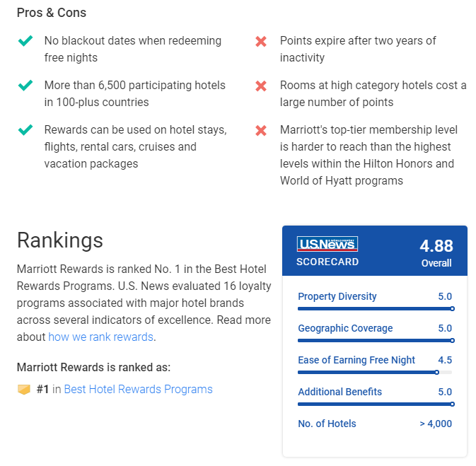 단점으로는 '포인트 소멸기한이 2년', '높은 등급(메리어트의 카테고리)의 호텔 이용 시 많은 포인트 필요', '최상위 등급 달성 조건이 어려움' 등이 있네요.
